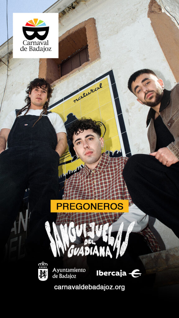 Carlos Candela, Juan Grande y Víctor Arroba, del grupo extremeño Sanguijuelas del Guadiana, serán los encargados de realizar el pregón inaugural del Carnaval de Badajoz 2026, Fiesta de Interés Turístico Internacional que se celebrará del 13 al 22 de febrero.