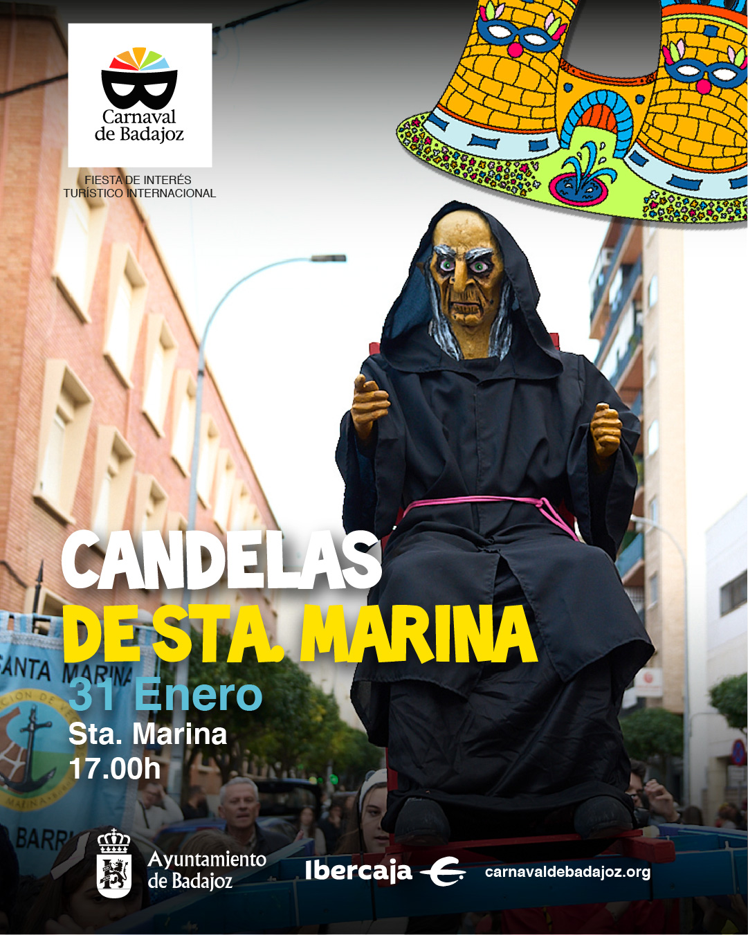 17.30 horas – Comienzo del desfile desde la Avda. de Colón con el siguiente recorrido: Avda. de Santa Marina, Avda. Villanueva, Saavedra Palmeiro a plaza Conquistadores, donde está ubicada la pira para la quema del “Marimanta”.